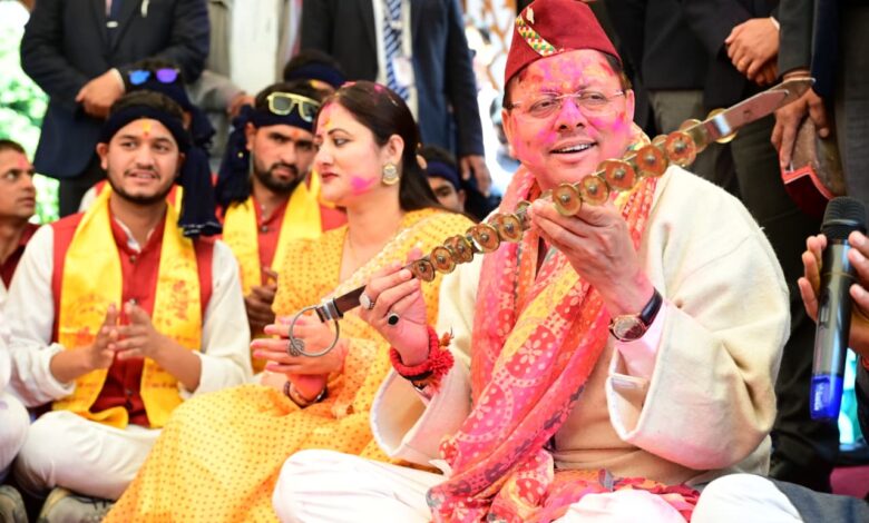 मुख्यमंत्री आवास का प्रांगण सोमवार को होली के रंगों में सराबोर नजर आया। इस दौरान प्रदेश की सांस्कृतिक समृद्धि और एकता के भी दर्शन हुए। पूर्वाह्न से ही प्रदेश भर के लोक कलाकारों, संस्कृति कर्मियों की टोलियां होली गायन करते हुए,  सीएम आवास पहुंचती रही। एक तरफ गढ़वाल-कुमाऊं से लेकर जौनसार तक का होली गायन था, नृत्य था। इस दौरान होली के गीत गूंजे। पारंपरिक गायन हुआ। ढोल, मंजीरे बजे। पारंपरिक वाद्य यंत्रों की संगत ने होली गीतों के प्रभाव को और बढ़ा दिया। आओ दगड़ियो, नाचा गावा, आ गई रंगीली होली का आह्वान यदि कुमांउ से आए कलाकारों ने किया, तो राठ क्षेत्र के कलाकारों ने गाया-आई डान्ड्यू बसंत, डाली मा मौल्यार।