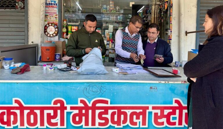 एम०एस० मेडिकल हॉल, नेहरूग्राम, देहरादून – संस्था के प्रो० एवं फॉर्मासिस्ट संजय कुमार उपस्थित पाये गए। फ्रिज में तापमान डिस्प्ले पाया गया और 04 सी०सी०टी०वी० कैमरे भी पाये गए। एक्सपायर दवाईयों का स्टोरेज भी व्यवस्थित रूप से पाया गया। कुछ ही दवाईयां एक्सपायर मिली। बताया गया कि नारकोटिक्स दवाईयों का विक्रय कम किया जाता है। निरीक्षण टीम द्वारा स्टोर में साफ-सफाई रखने के साथ लॉइसेन्स की शर्तों का पालन करने के निर्देश दिये गए।